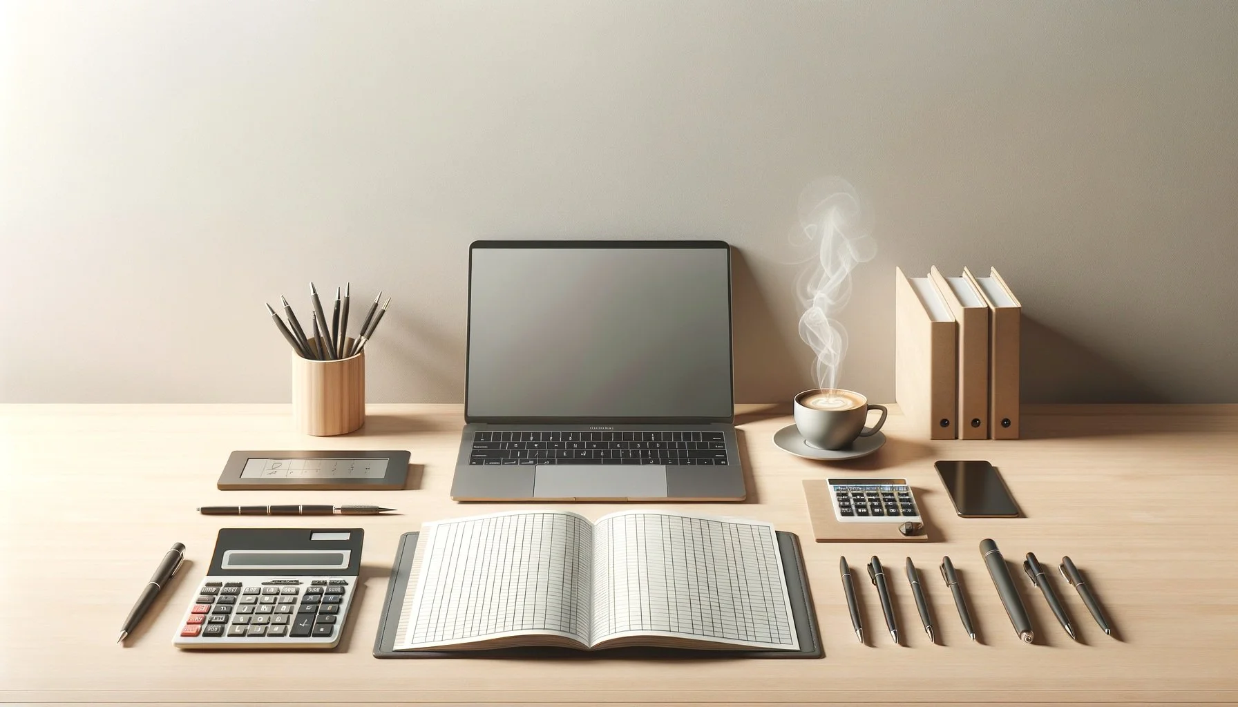 Organized desk with laptop, coffee cup, calculator, jar of pens, books, and a bookkeeping ledger for Grand Rapids Bookkeeper LLC